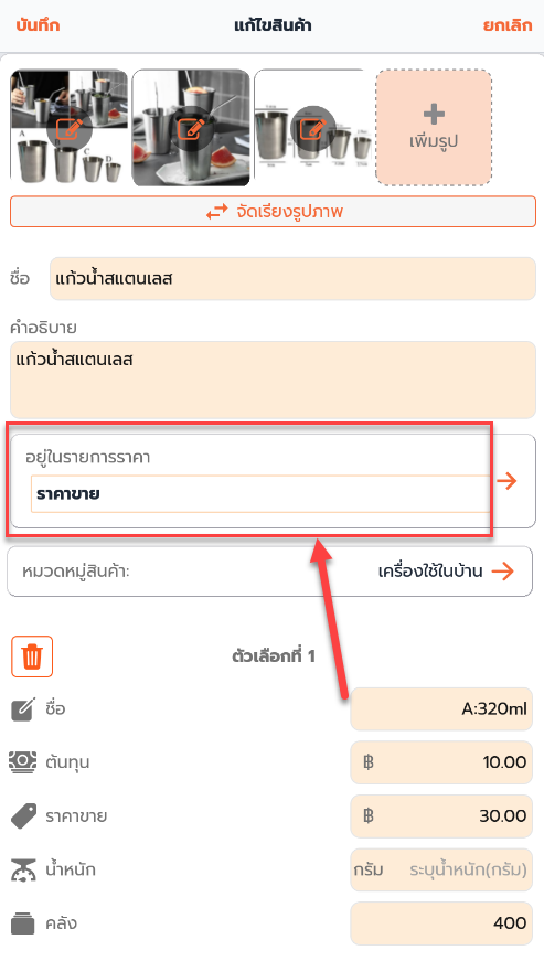 4. เมื่อย้อนกลับมาหน้าแก้ไขสินค้า จะเห็น รายการราคาที่กำหนดไว้ สามารถระบุแต่ราคา ที่ต้องการได้เลย