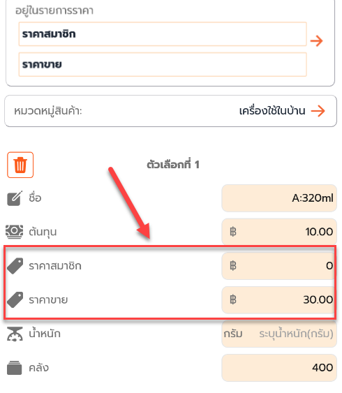 ตัวอย่าง เลือก ราคาขายปลีก และ ราคาสมาชิก และกด ตกลง เพื่อบันทึก