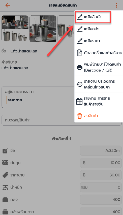 1. เลือกสินค้าที่ต้องการแก้ไข กดที่ปุ่ม จุดไข่ปลา > แก้ไขสินค้า (ตามรูป)