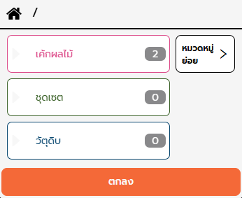 6. หากต้องการสร้างหมวดหมู่ย่อย ให้กดที่หมวดหมู่หลัก เช่น หมวดหมู่ เค้กผลไม้ และ กด สร้างหมวดหมู่ย่อย