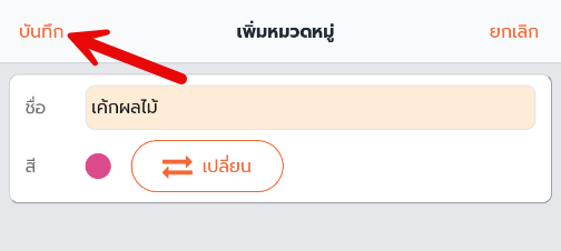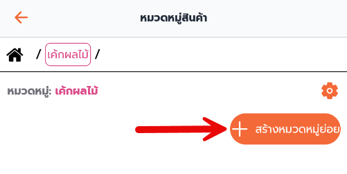5. หากต้องการสร้างหมวดหมู่ย่อย ให้กดที่หมวดหมู่หลัก เช่น หมวดหมู่ เค้กผลไม้ และ กด สร้างหมวดหมู่ย่อย
