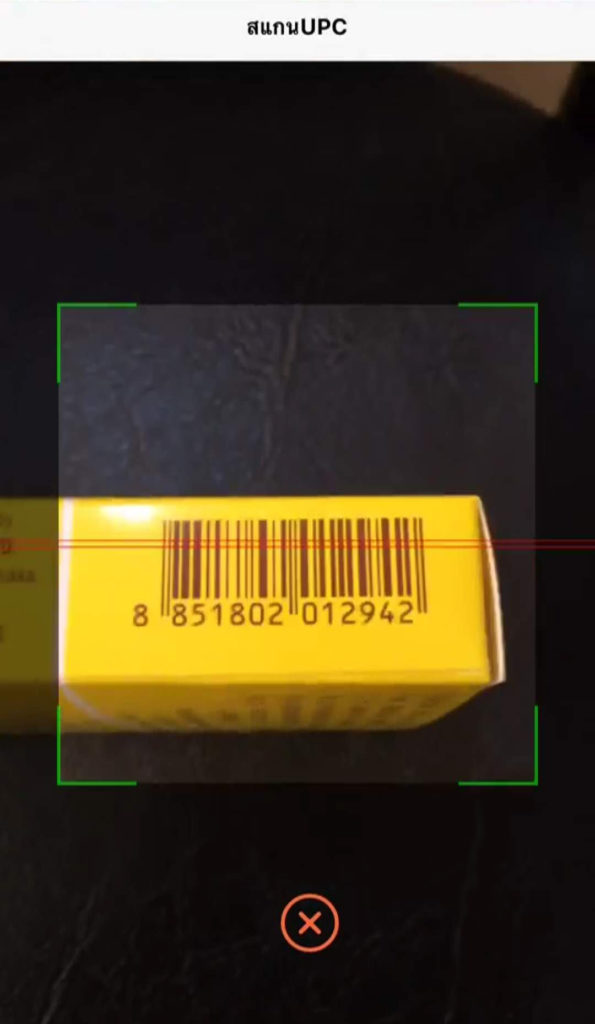 ตัวอย่างการสแกนบาร์โค้ด UPC ผ่านกล้องสแกนบาร์โค้ด เมื่อสแกนเสร็จ จะขึ้นรหัสตัวเลขของสินค้า UPC นั้น แล้วกด บันทึก เพื่อบันทึกรหัสบาร์โค้ด
