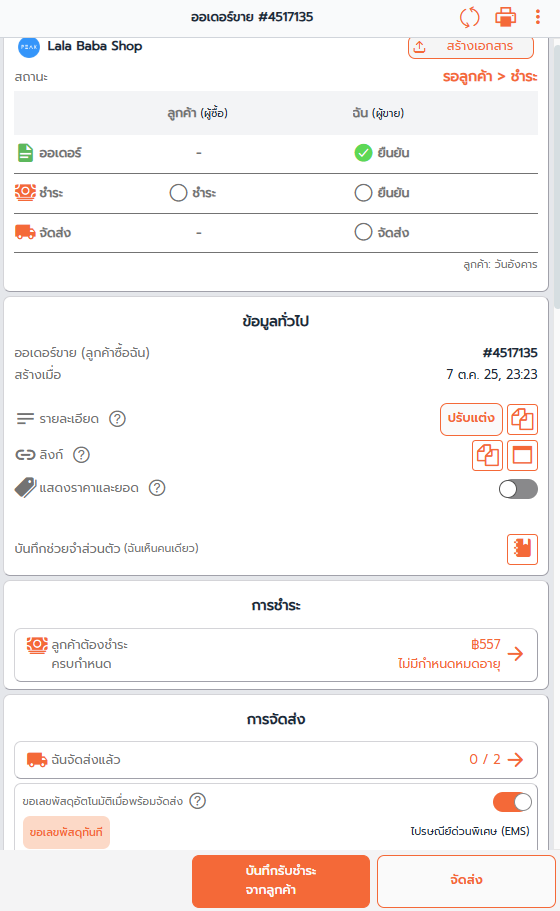 ระบบจะเปิดสวิตซ์ จัดส่งก่อนชำระ > เพื่อให้สามารถออกเลขพัสดุจากขนส่งได้ทันที และส่งข้อมูลนี้ไปให้ยังพนักงานขนส่งให้ทราบว่าเป็นออเดอร์ใบปะหน้าพัสดุแบบเก็บเงินปลายทาง และสถานะแจ้งว่าออเดอร์นี้เป็นแบบเก็บเงินปลายทาง