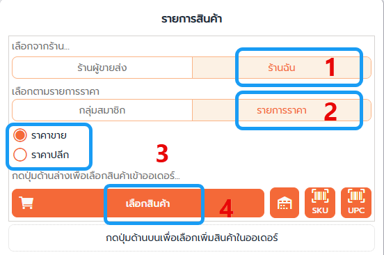 เช่นตัวอย่างคือ เลือกสร้างออเดอร์จาก ร้านฉัน > รายการราคา ราคาขาย