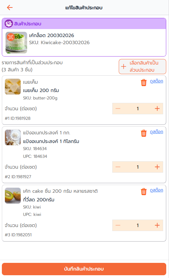 2. แก้ไขข้อมูลสินค้าในเซต ตามต้องการและกด บันทึกสินค้าประกอบ