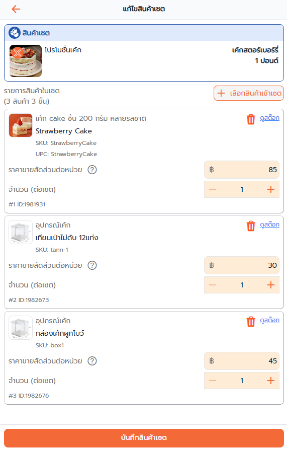 2. แก้ไขข้อมูลสินค้าในเซต ตามต้องการและกด บันทึกสินค้าเซต