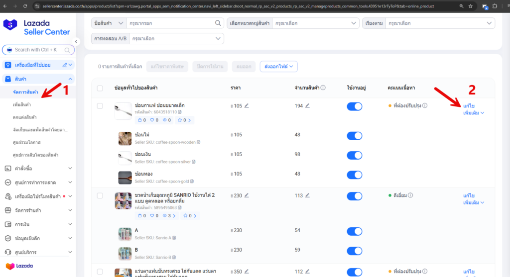 - ไปที่ สินค้า → จัดการสินค้า