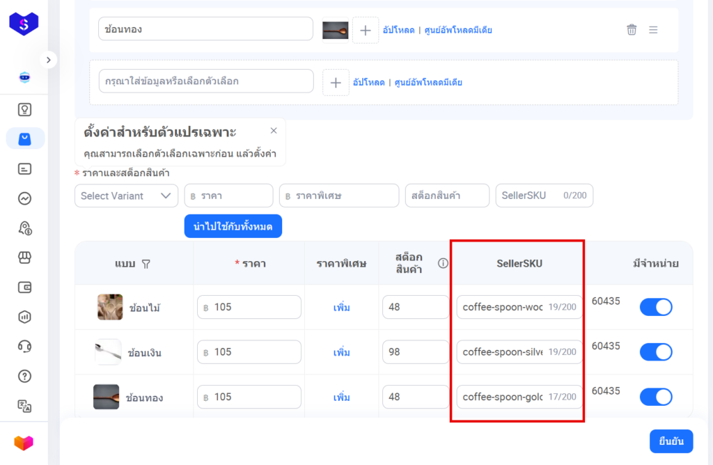 - จะเห็นช่อง SellerSKU ของแต่ละตัวเลือก