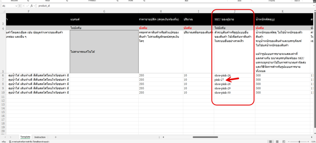 ð SKU ของผู้ขาย (คอลัมน์ J ตามรูป)