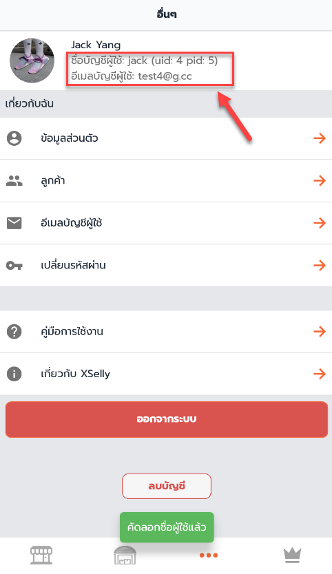 ไปที่ หน้า “อื่นๆ” (tab ที่ 3 ตามรูปด้านล่าง) ก็จะเห็น ชื่อบัญชีผู้ใช้ แสดงด้านบน