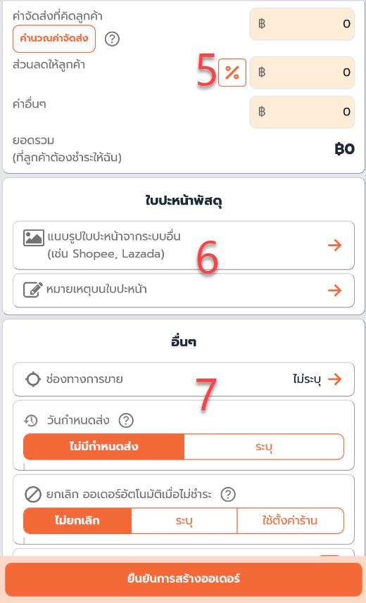 กรอกข้อมูล ออเดอร์ โดยแบ่งเป็น 6 ส่วนหลัก สามารถกดดูรายละเอียดแต่ละส่วนเพิ่มเติมได้ดังนี้