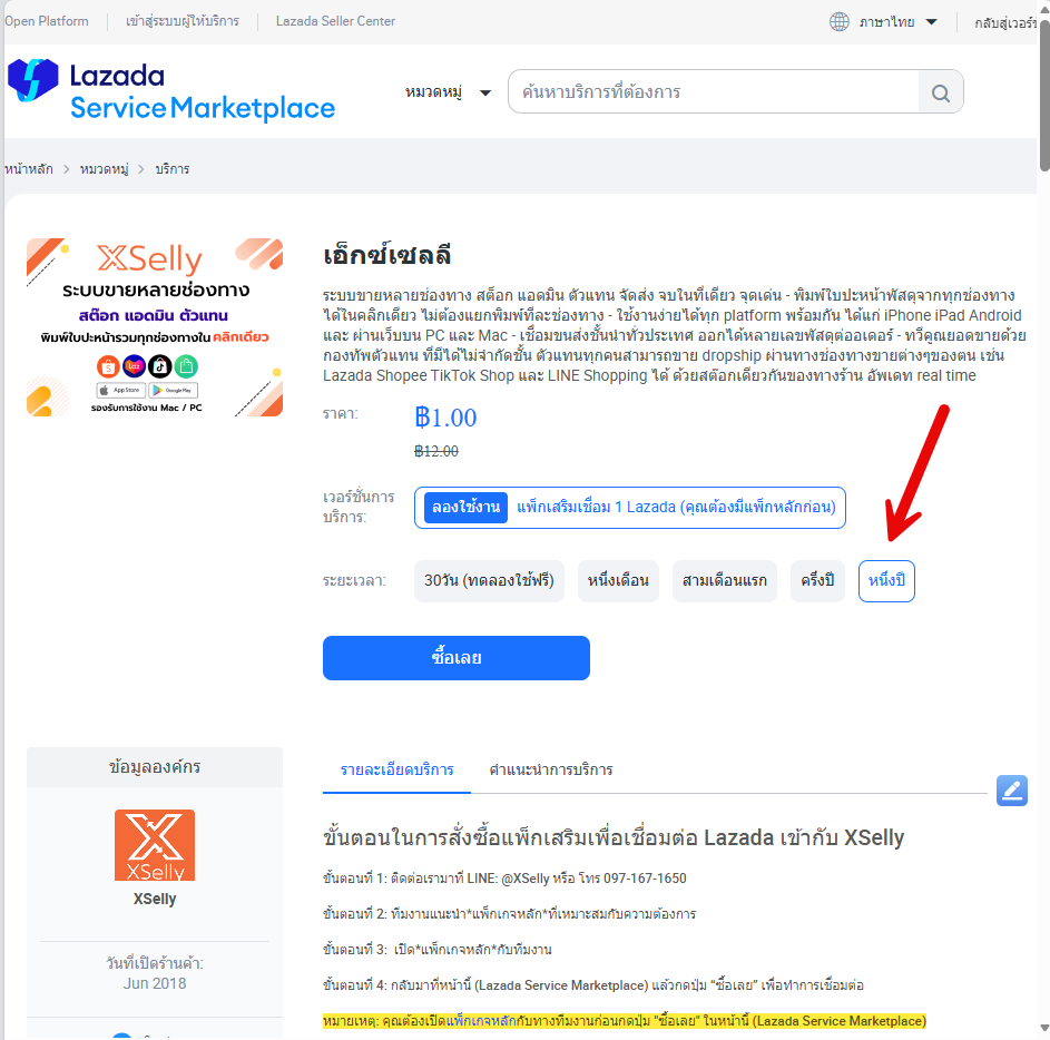 1. ล๊อกอินเข้าร้านค้าที่ต้องการเชื่อมบน lazada seller กดเลือกเชื่อมต่อรับข้อมูลแบบ หนึ่งปี และกด ซื้อเลย