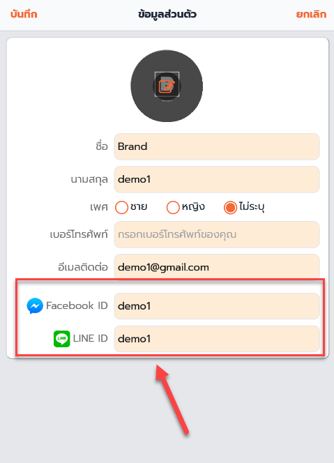 2. กรอก FB Messenger ID และ LINE ID จากนั้นกด บันทึก