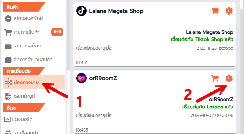 (Shopee / Lazada / TikTok Shop / LINE SHOPPING) - คลิกไอคอน ⚙️ (ตั้งค่า) ของร้านค้านั้น