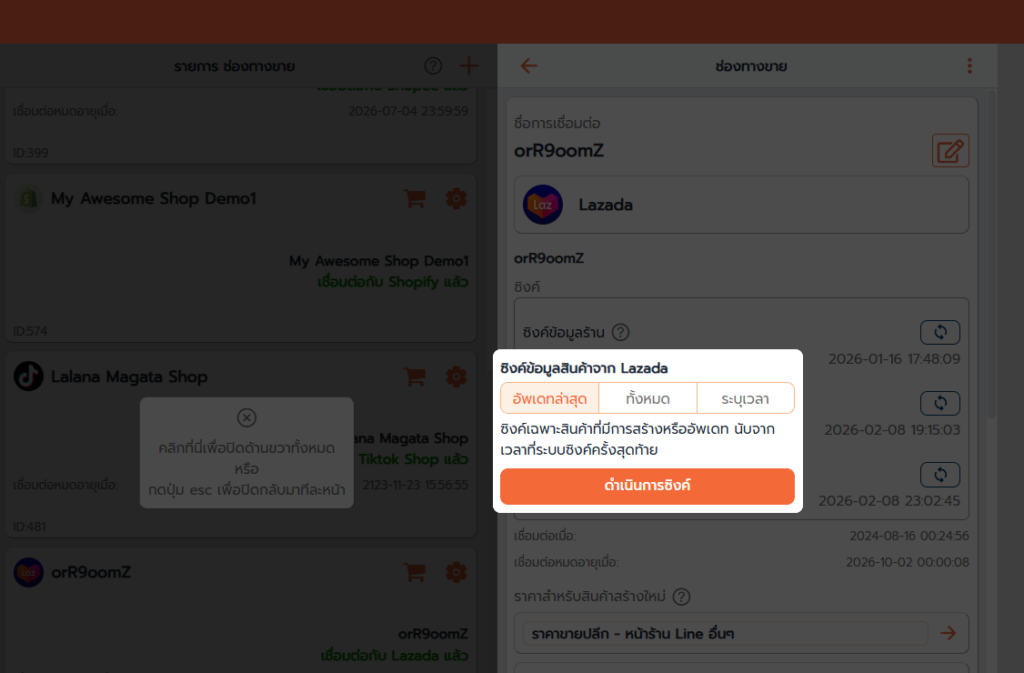 - เลือกร้านค้า Lazada ที่ต้องการตั้งค่า