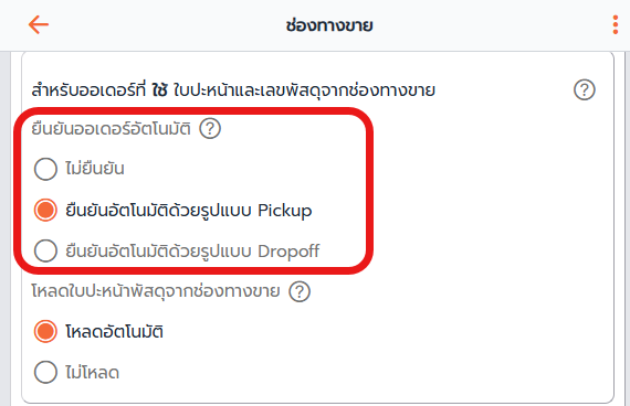 สำหรับออเดอร์ที่ใช้ใบปะหน้าและเลขพัสดุจากช่องทางขาย - ที่หัวข้อ ยืนยันออเดอร์อัตโนมัติ