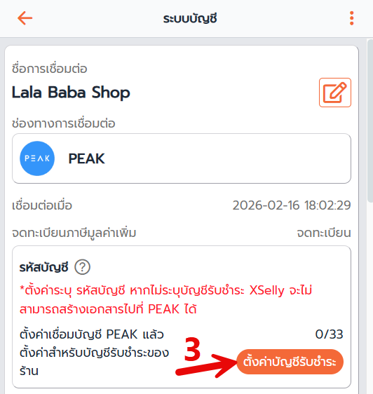 ถ้าขึ้นข้อความสีแดงว่า ยังไม่ได้ผูกรหัสบัญชี PEAK ให้กดเข้าไปตั้งค่า