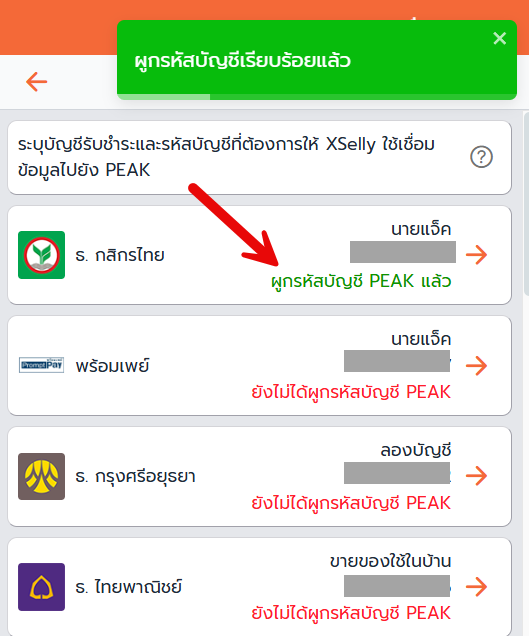 - ระบบจะแสดงข้อความสีเขียว ผูกรหัสบัญชี PEAK แล้ว