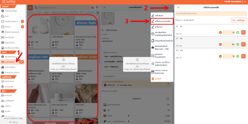 ขั้นตอนที่ 4.1 — เลือกเมนู จัดการจำนวนสินค้า จากนั้นเลือกประเภทการจัดการ เช่น เพิ่มจำนวน / ลดจำนวน / ปรับยอด