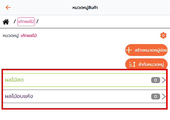 5. หากต้องการสร้างหมวดหมู่ย่อย ให้กดที่หมวดหมู่หลัก เช่น หมวดหมู่ เค้กผลไม้ และ กด สร้างหมวดหมู่ย่อย