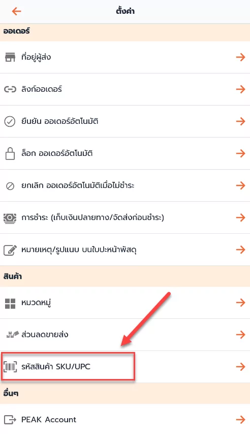 – กดที่เมนูหลักด้านซ้ายในหมวด “อื่นๆ” > กด “ตั้งค่าร้าน” > กด “รหัสสินค้า SKU/UPC“