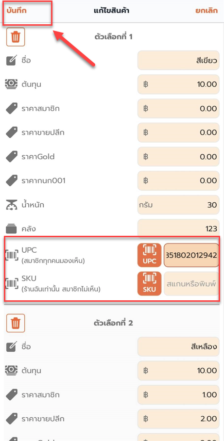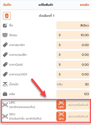 2. เลือก รหัส SKU/UPC ในหมวด สินค้า