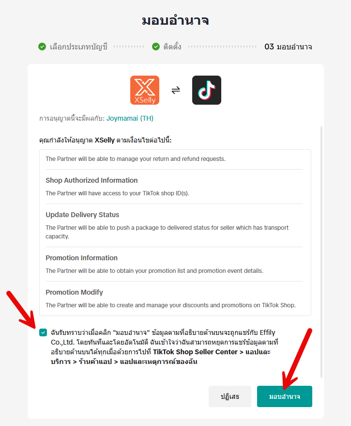 8. มอบอำนาจให้ XSelly สามารถซิงค์ออเดอร์ และ สต๊อกสินค้าได้ จากนั้นกด มอบอำนาจ