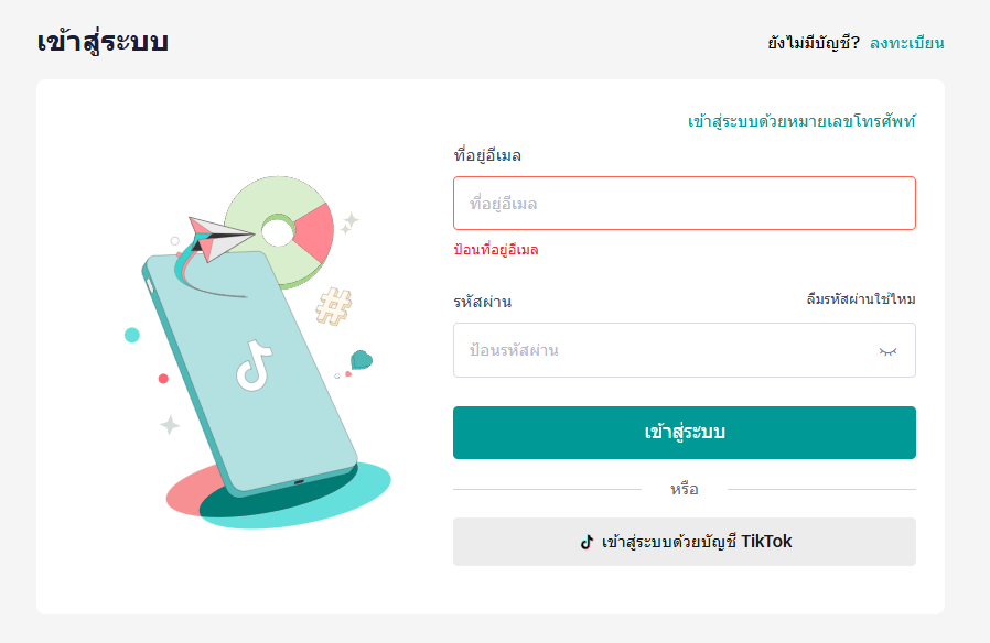 6. ล๊อกอินเข้าสู่ระบบ Tiktok Seller ด้วย เบอร์โทรศัพท์ หรือ อีเมล์