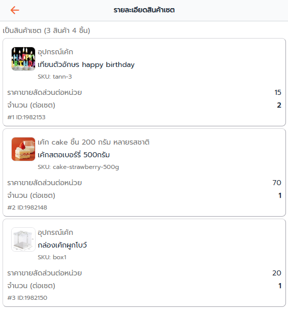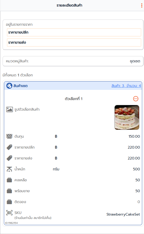 ตัวอย่าง เซตตัวเลือกที่ 1 ประกอบไปด้วย 3 สินค้า จำนวน 4 ชื่อ เมื่อกดเข้าไปดูจะเห็นข้อมูลสินค้าเดี่ยว
