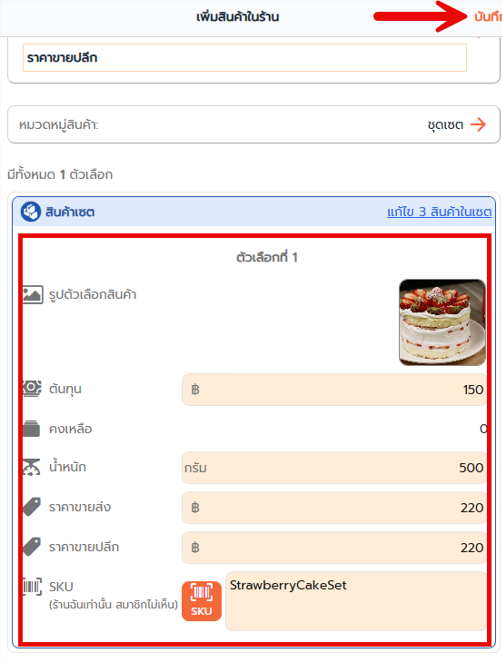 4. กรอกข้อมูลตัวเลือกสินค้าเดี่ยวในเซต และกด บันทึก