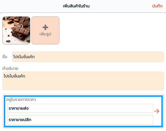 2. เลือก อยู่ในรายการราคา จากนั้นแตะที่ปุ่ม และ เลือกรายการราคา ที่จะกำหนดราคาให้สินค้าชิ้นนี้