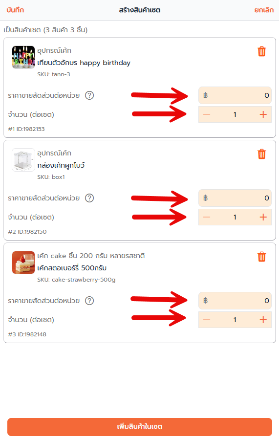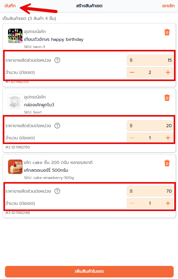 ให้กดที่ แก้ไข 3 สินค้าในเซ็ต และ กดบันทึก