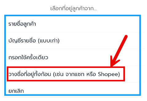 ตัวอย่างเลือก “วางชื่อที่อยู่ทั้งก้อน (เช่น จากแชท หรือ Shopee)”
