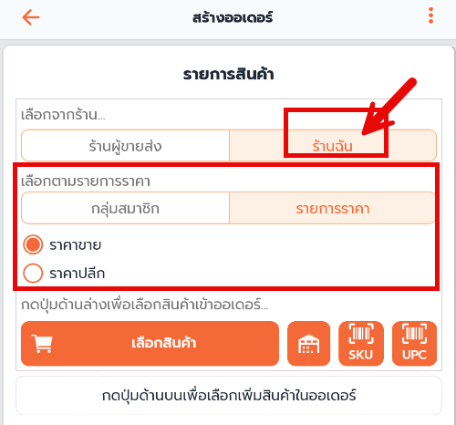 เลือกจากร้าน…. ร้านผู้ขายส่ง เลือกร้านที่ต้องการสร้างออเดอร์