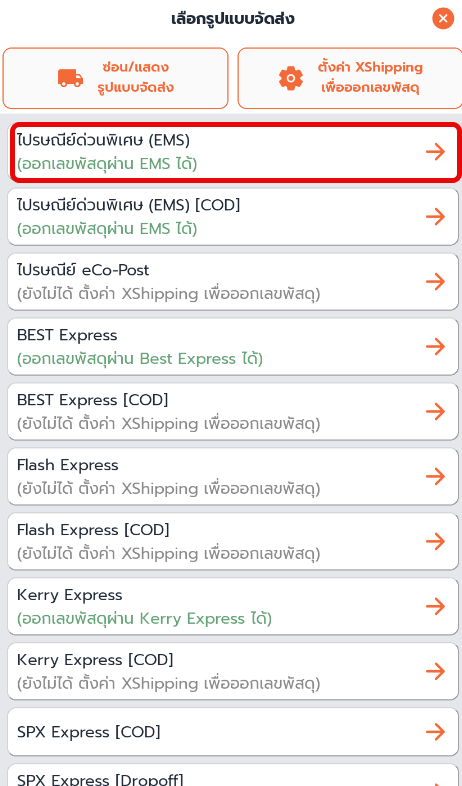 ตัวอย่างเลือก รูปบบขนส่ง แบบ ไปรษณีย์ด่วนพิเศษ EMS