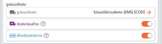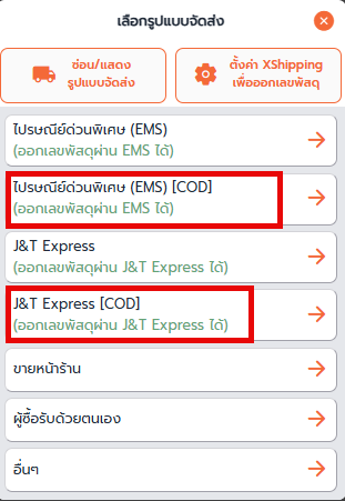 2. เพิ่ม รูปแบบจัดส่ง ตามขนส่งที่ต้องการใช้ออกเลขพัสดุ โดยให้ขนส่งที่เลือกมีคำว่า COD กำกับไว้