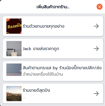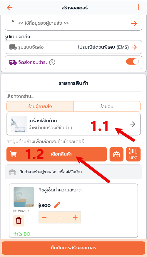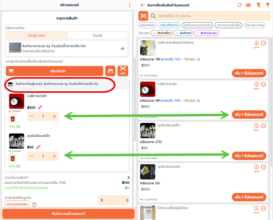 หากเป็นสินค้าที่ถูกดึงมาเปิดสร้างออเดอร์จากร้านผู้ขายส่ง ตรงแถบด้านบนของรายการสินค้าจะแจ้งว่าสินค้าที่ดึงมาเป็นของร้านผู้ขายส่งร้านไหน