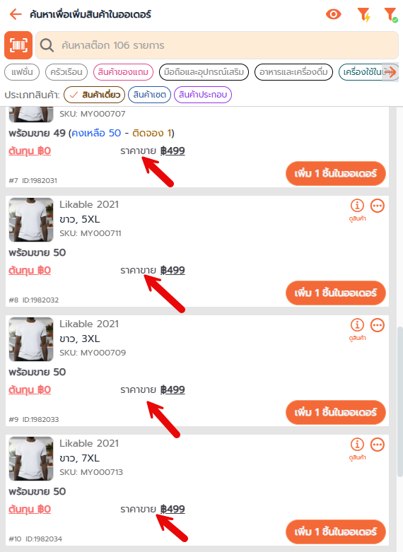 ตัวอย่าง เมื่อกด เพิ่มสินค้า จะเห็นเฉพาะรายการราคา ราคาขาย