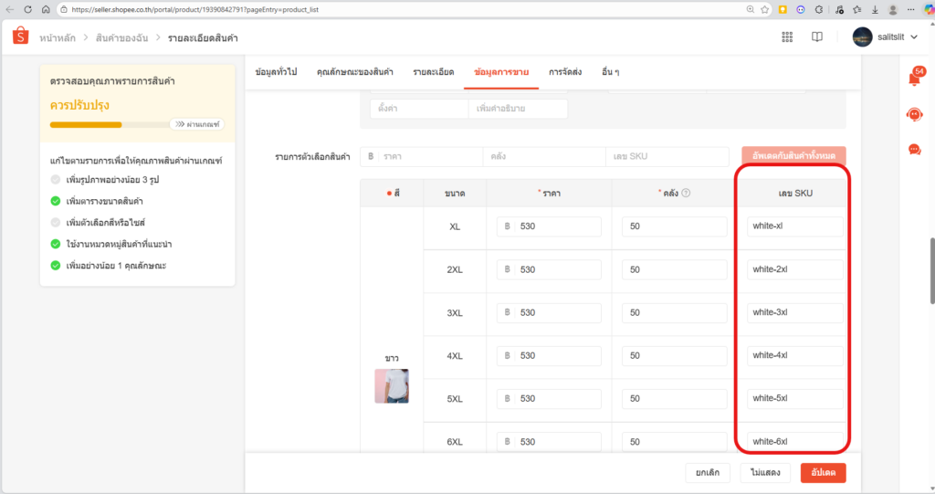 white-xl,white-2xl,black-m - กดปุ่ม อัปเดต ระบบจะบันทึก SKU ใหม่ทันที