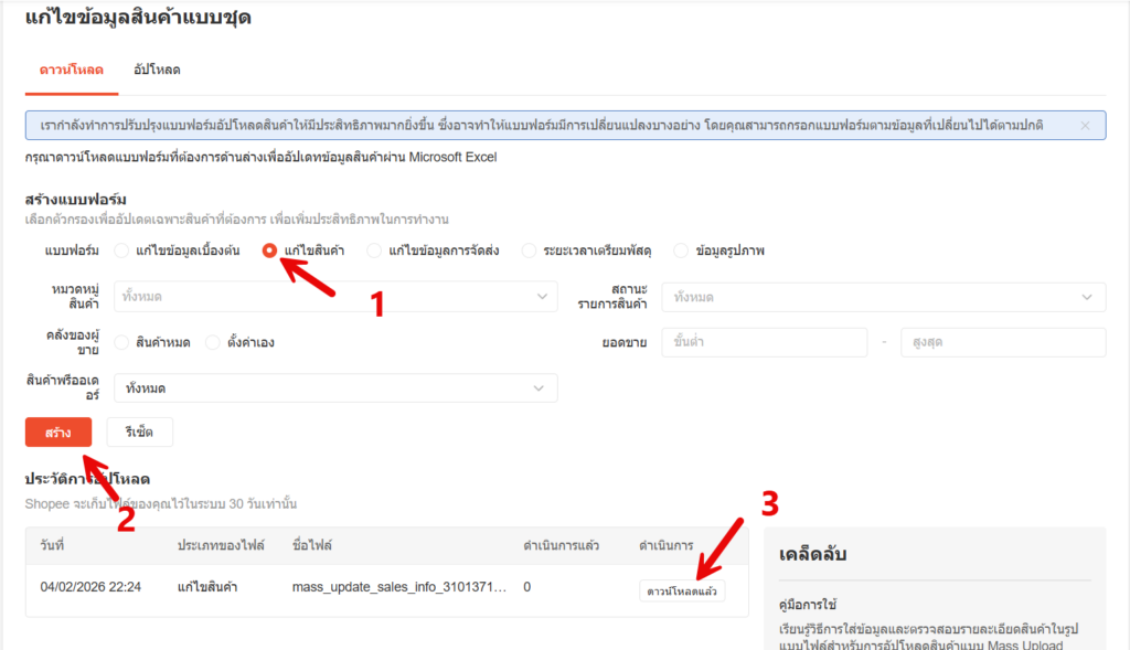 - ดาวน์โหลดไฟล์ Excel จากประวัติการดาวน์โหลด เพื่อใช้ไฟล์น้ในการแก้ไขข้อมูล SKU สินค้า
