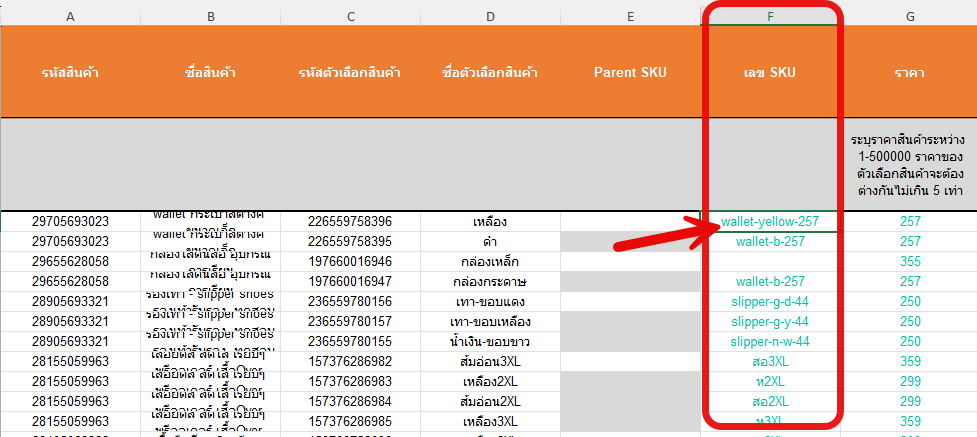 - 1 แถว = 1 ตัวเลือกสินค้า (Model) เช่น wallet-y-257 เปลี่ยนเป็น wallet-yellow-257