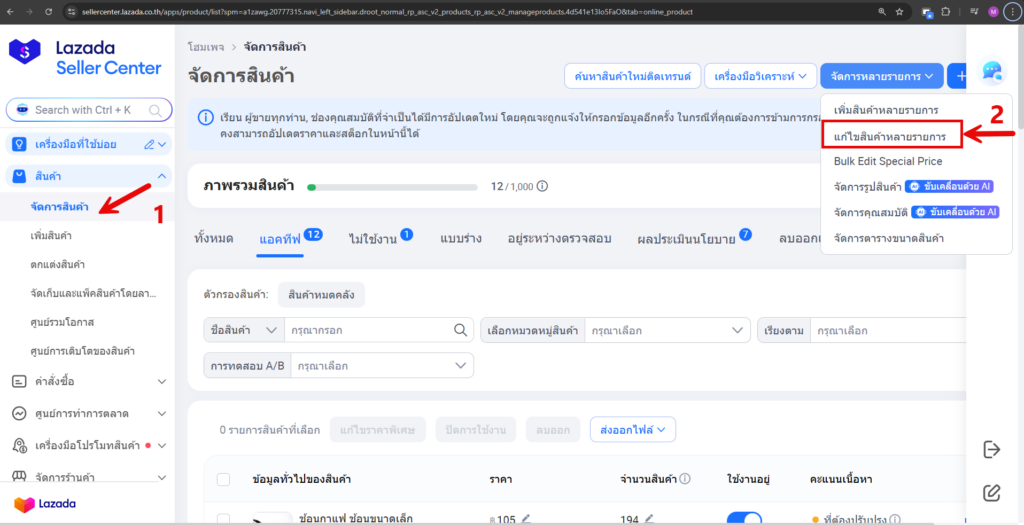 - เลือก แก้ไขสินค้าหลายรายการ (ตามกรอบแดงในรูป)