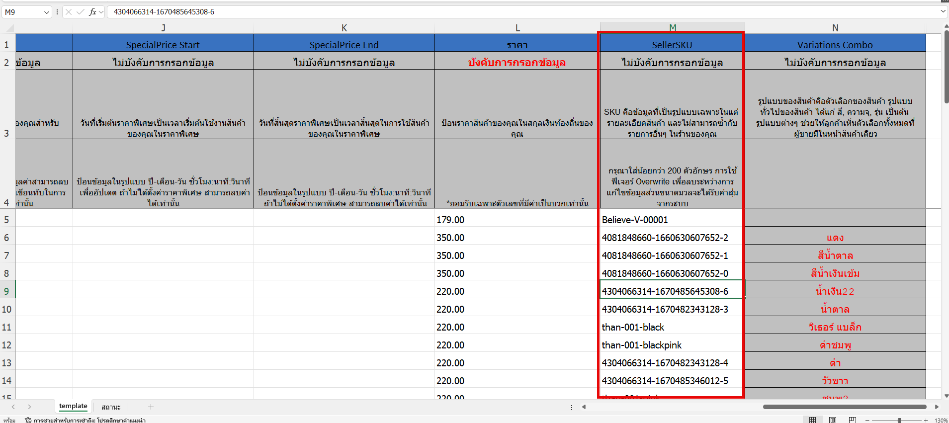 SellerSKU (คอลัมน์ M ตามรูป)