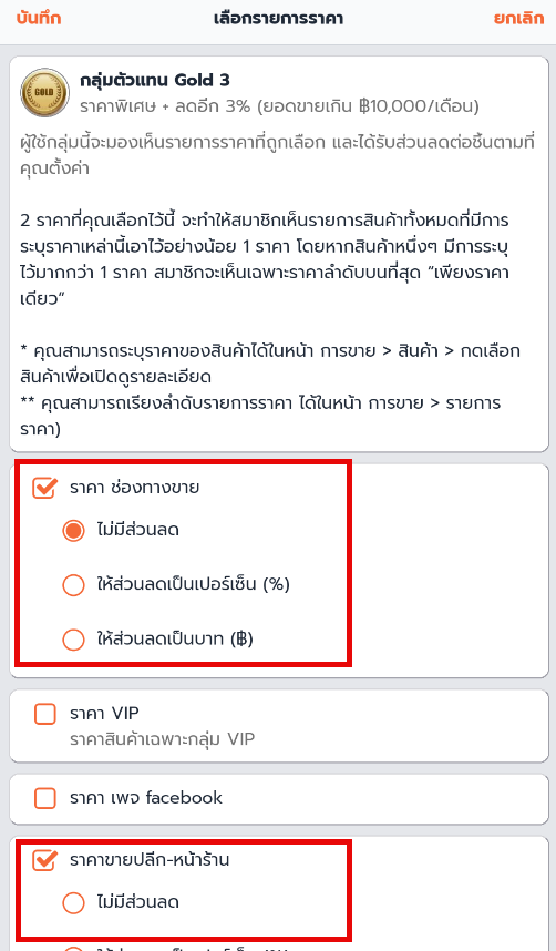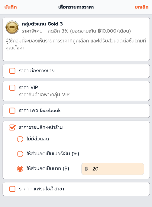 3. เลือก กลุ่มที่ต้องการตั้งค่า รายการราคาขาย และ กรอกรายละเอียด ประเภทราคาที่ต้องการจะตั้ง แตะ บันทึก