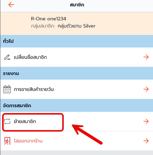 4. ถ้าต้องการย้าย สมาชิกไปอยู่อีกกลุ่มภายในร้านขายส่งของฉัน แตะ ย้ายสมาชิก