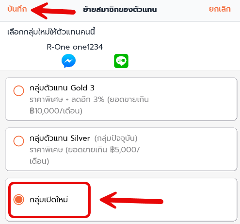 5. เลือก กลุ่มตัวแทน ที่ต้องการ ย้ายสมาชิกของตัวแทน แล้วกด บันทึก