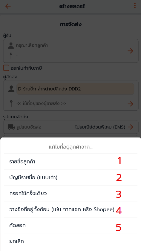 ข้อมูลผู้รับสินค้าสามารถเลือกได้ 4 แบบ