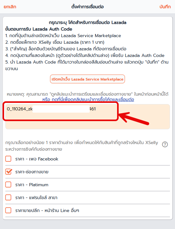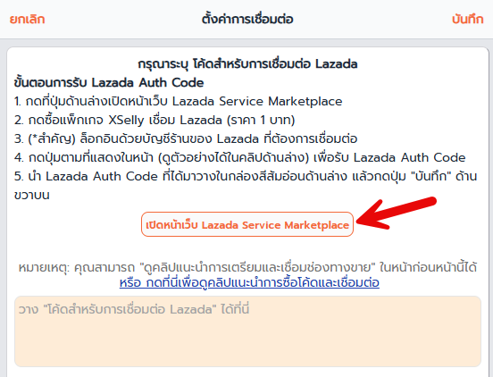 7. ย้อนกลับมาที่หน้า ตั้งค่าการเชื่อมต่อ Lazada และ วางโค้ดที่คัดลอกมา ในช่องใส่โค้ด และกดปุ่ม บันทึก