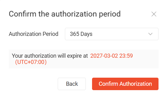 1. เลือกให้ระบบสามารถเชื่อมต่อข้อมูลระหว่าง XSelly และ Shopee เป็นเวลาสูงสุด 365 วัน กดปุ่ม “Confirm Authorization”
