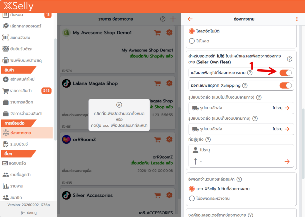 ขั้นที่ 1 — เปิดการแจ้งเลขพัสดุไปยังช่องทางขาย
